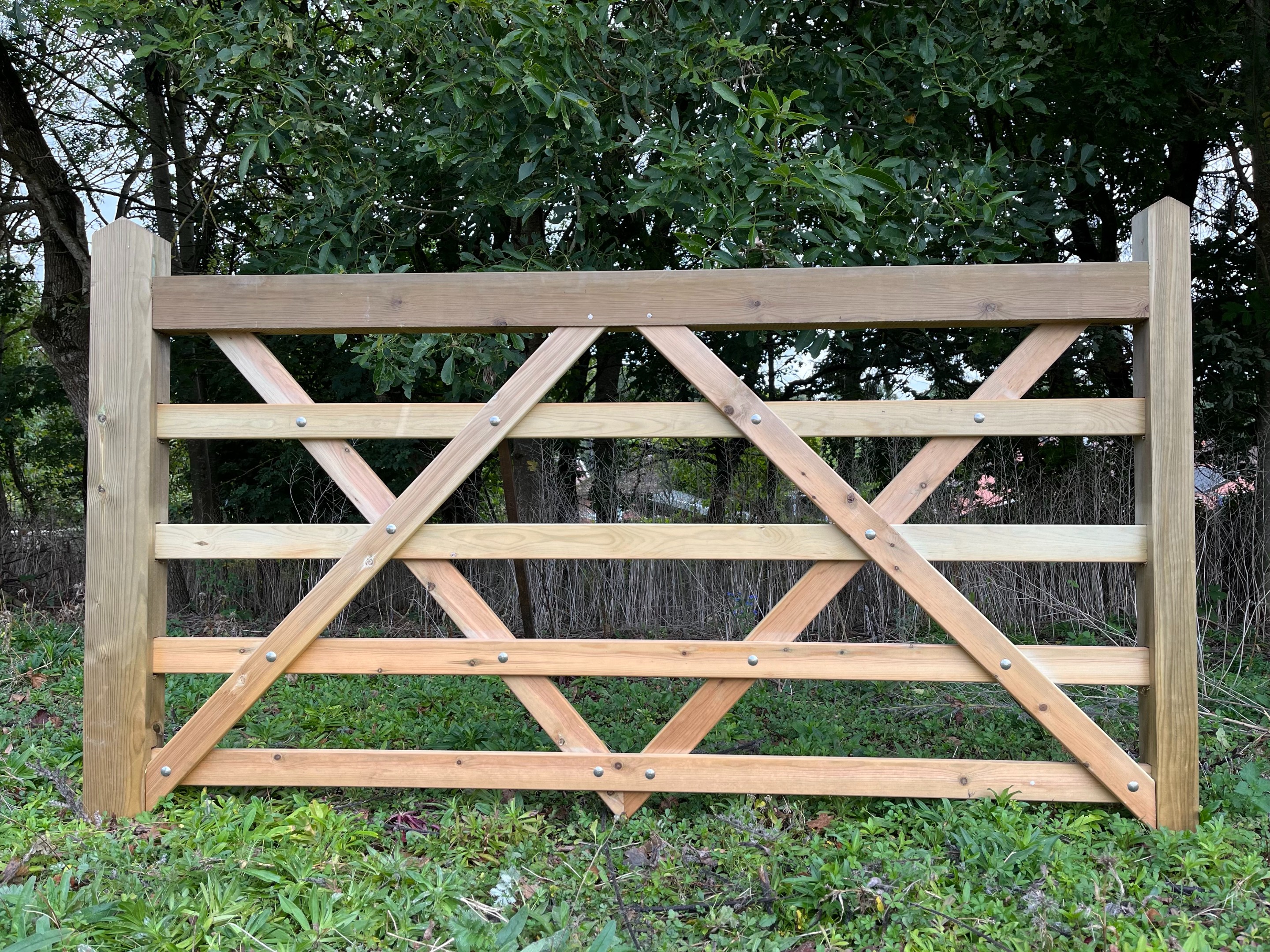 Image shows a left hand hanging 12'0 wide gate. The 7'0 gate is also double diamond braced