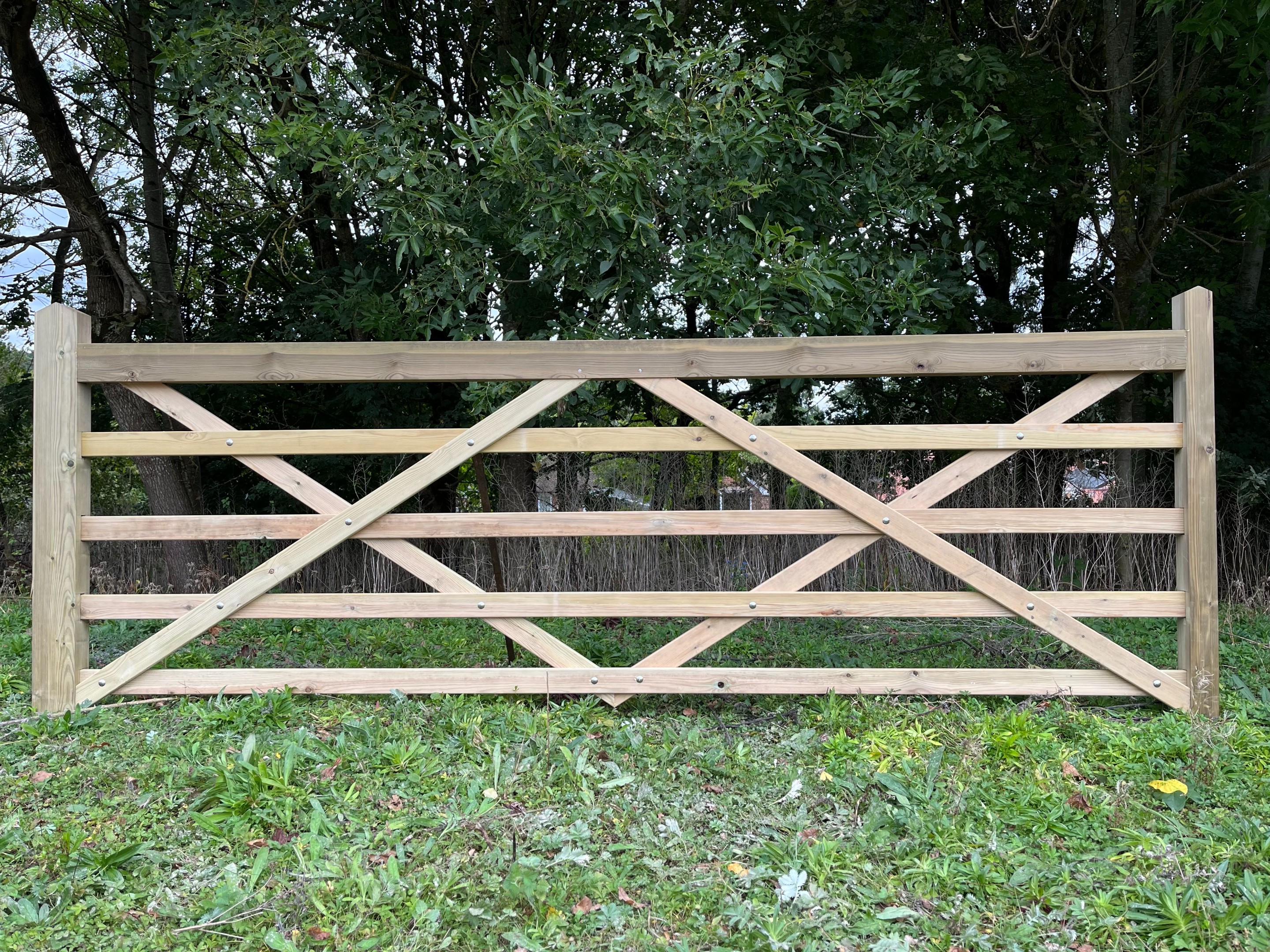 Image shows a left hand hanging 12'0 wide gate. The 11'0 gate is also double diamond braced
