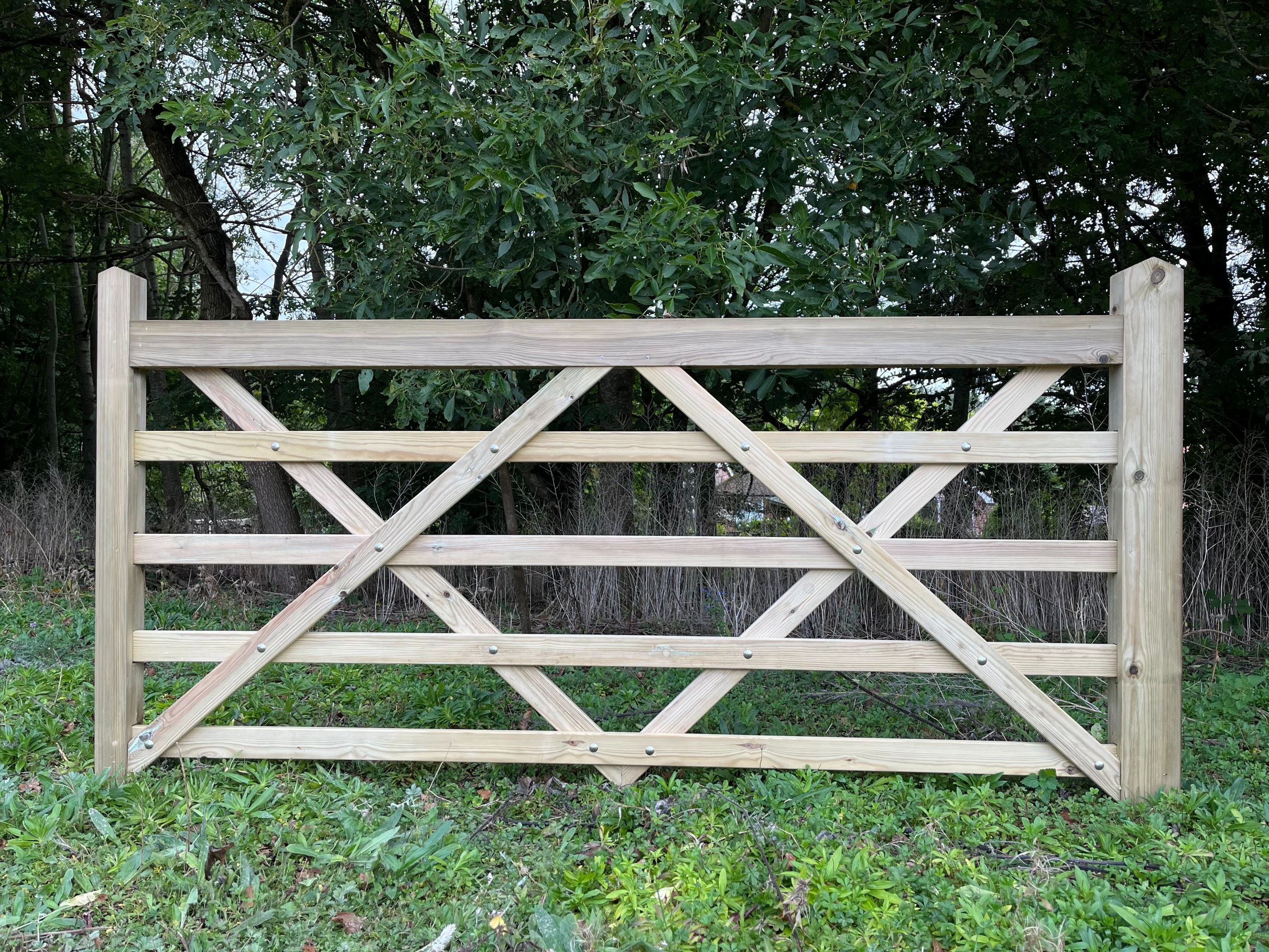 Image shows a left hand hanging 12'0 wide gate. The 8'0 gate is also double diamond braced